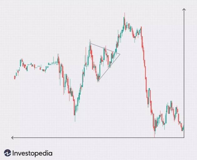 페넌트 형 패턴은 두 개의 추세선이 한곳에서 만날 때 발생한다. 좀 더 정확히 설명하면 하나의 추세선은 밑으로 향하고, 다른 하나의 추세선은 위로 향하여 한 곳에서 만나는 모양이다(아래 그림). 보통 페넌트 형 패턴이 형성되는 중에는 거래량이 감소하다가, 갑자기 거래량이 늘며 가격도 따라 급등하는 모습을 보인다.