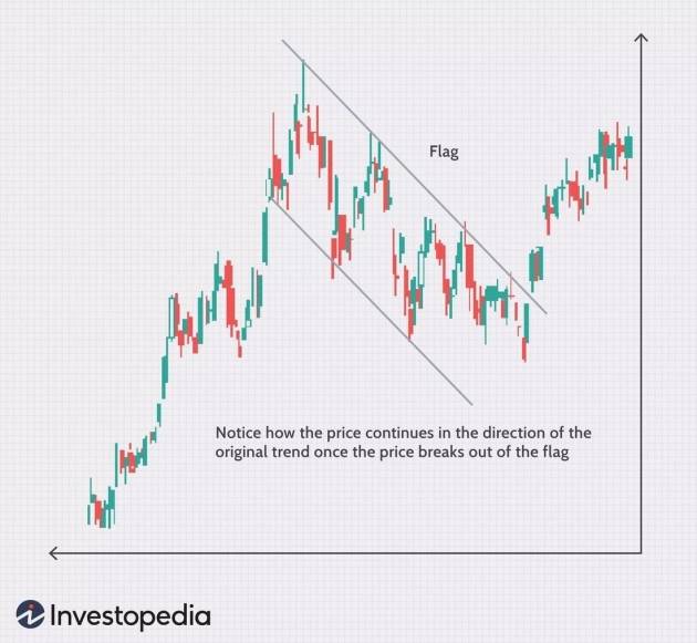 플래그 패턴은 두 개의 추세선이 평행을 이뤄 위 또는 아래로 향할 때 나타난다. 주로 위로 향하는 플래그 패턴이 나타나면 하락 후에 박스권 및 수렴하는 형태를 보이다가 추가 하락을 기대할 수 있고, 아래로 향하는 플래그 패턴이 나오면 상승 후에 박스권 및 수렴 형태를 띠다가 크게 상승할 가능성이 있다 (아래 그림).