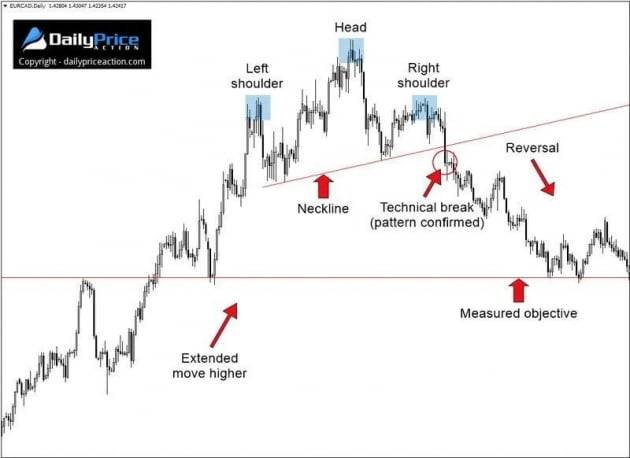 시장이 장기간의 랠리 후 고점을 찍고 하락 반전할 때 전형적으로 나타나는 패턴이다. 언뜻 보면 왼쪽과 오른쪽 어깨의 생김새가 똑같이 닮은 것 처럼 보이지만, 자세히 보면 오른쪽 어깨의 저점이 목선(Neckline, 머리와 어깨를 구성하는 고점들 사이의 두 개 저점을 연결하여 만든 선)보다 밑으로 내려오며 본격적인 하락이 시작되었음을 알 수 있다. 헤드앤숄더는 상승에서 하락으로 추세가 전환될 때 자주 출몰하는 패턴 중 하나이다.
