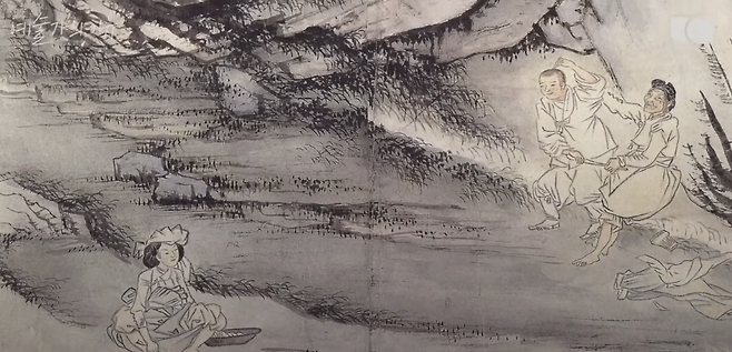 오른쪽 승려는 왼쪽 여인들을 바라보는 교차된 시선.