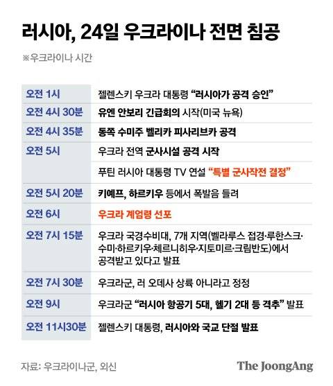 ■ 2022.02.24 오후 1:21 우크라 수도에 미사일 때린 푸틴, 남부 해안 상륙작전 감행 러시아가 24일(현지시간) 우크라이나를 향한 전면 침공을 시작했다. 블라디미르 푸틴 러시아 대통령이 이날 오전 우크라이나 동부 돈바스 지역을 겨냥한 특별 군사작전을 선포한 직후다.
