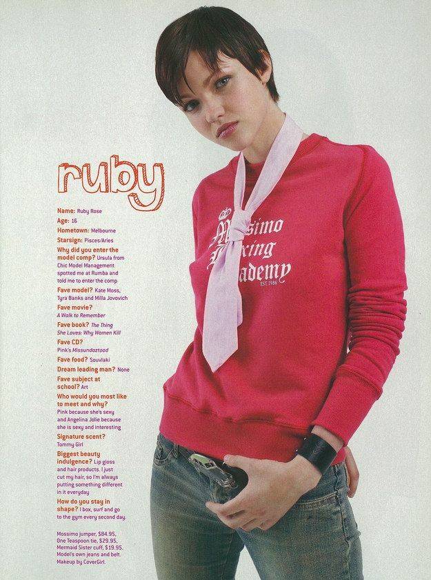 루비 로즈는 2002년 호주의 패션지 ‘걸프렌드’에서 모델로 데뷔했다. ‘걸프렌드’는 매년 신인 모델을 뽑는 경연을 열었는데, 루비 로즈가 2002년 경연에서 2위로 뽑혔다.(그해 1위는 캐서린 맥닐이었다) 이런 경연에서 장점이 있었는지, 2007년엔 호주 MTV에서 신입 VJ를 뽑는 경연에서 1위를 차지했다. 당시 경쟁률은 2000:1. 그는 100분에 맥주 100잔 마시기 같은 희한한 도전도 과감하게 소화했다. 나중에 말하길 그는 “모델이 되는 건 주변 사람들에게 더 예쁘고, 더 마르고, 그런 변화를 기대받는 것이지만 MTV는 그저 자기 자신이 되는 걸 원했다”고 언급했다.