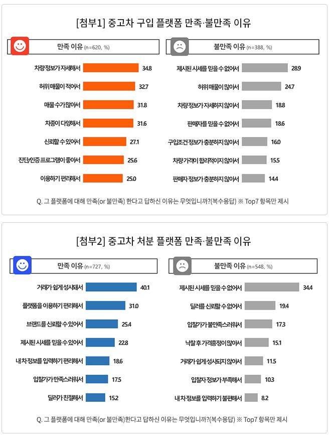 만족 또는 불만족 이유를 보면 이용자들이 중고차 플랫폼에 요구하는 사항은 풍부한 정보, 신뢰성, 이용 편의성으로 요약된다. 특히 불만 요인으로 △제시된 시세를 믿을 수 없어서 △허위매물이 많아서 △입찰된 시세를 믿을 수 없어서 △딜러를 신뢰할 수 없어서 등 '신뢰' 측면이 절대적이었다[첨부1, 2].