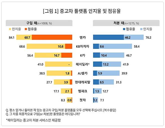 자동차 전문 조사기관 컨슈머인사이트가 2001년부터 수행해 온 ‘연례 자동차 조사(매년 7월 약 10만명 대상)’에서 플랫폼을 이용해 중고차를 구입 또는 처분한 소비자(구입 1008명, 처분 1275명)에게 이용경험과 만족도를 묻고 이를 브랜드 별로 비교했다.