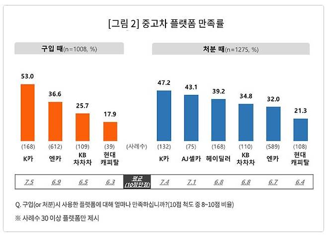 중고차 플랫폼 인지율과 점유율은 '엔카'가 독보적이었으나, 만족률은 'K카'가 가장 높았다. KB차차차 등 일부 후발주자는 상당한 수준의 인지도를 확보했음에도 이를 실제 점유율로 연결하지 못하고 있었다. 만족률은 신차에 비해 매우 낮았는데 이는 중고차의 고질인 ‘신뢰성 부족’ 때문으로 보인다.