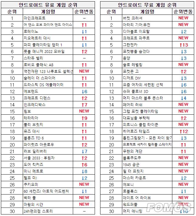안드로이드 무료 게임 순위에서도 신작 게임이 강세를 보였다.