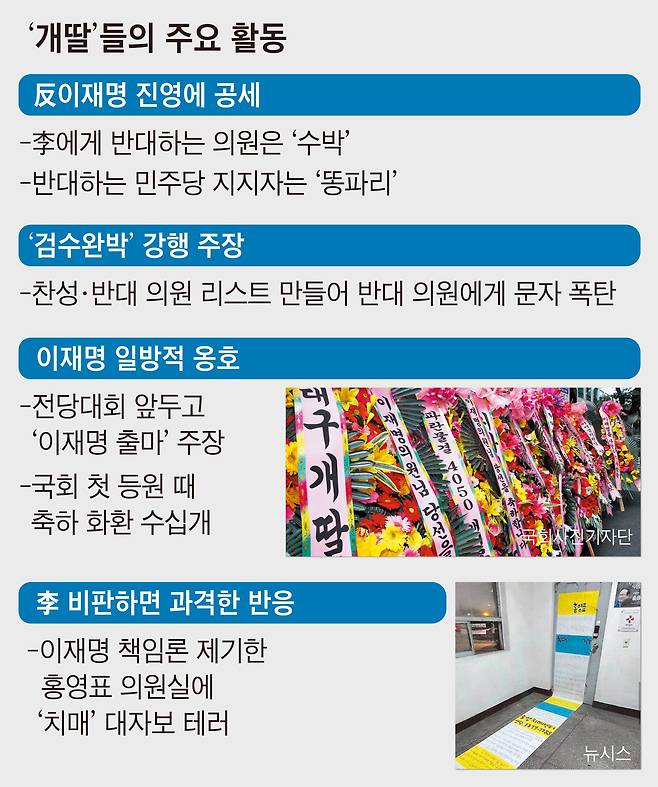 자칭 개딸들은 이날 국회 앞에 화환 수십 개를 보내 국회 정문 앞에 도열시켰다. 화환에는 “당신과 언제나 동행하겠습니다” “개혁하는 이재명의 민주당” “이재명 건드리면 출동한다” 등의 문구가 적혀 있었다. 보낸 이들은 “잼마을(재명이네 마을) 콘크리트 지지자 잼딸 드림” “잼마을 창원 개이모” “마을 주민” 등이었다. 이 의원의 남성 지지자들인 양아들(양심의 아들)이 보낸 화환도 간간이 보였다. 한 여성 지지자는 국회에 도착한 이 의원에게 꽃다발을 건넸고, 또 다른 지지자는 “이재명, 당대표 가자!”라고 외쳤다. 민주당 관계자는 “추미애 전 법무장관이 윤석열 당시 검찰총장과 싸울 때 서초동에 서 있던 화환이 생각난다”고 했다. 아이돌을 따라다니는 ‘사생 팬’의 정치 버전이라는 말까지 나오고 있다. 과거 극렬 지지층의 문자 폭탄을 묵인했던 친문계도 개딸들의 ‘화력’과 ‘전투력’에 놀라고 있다.
