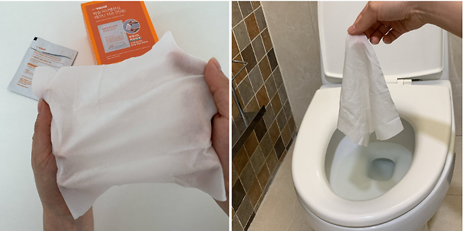 근데 이 제품은 물티슈처럼 생겼지만 휴지통이 없는 화장실에서도 물에 녹는 원단이라 변기에 넣고 같이 내려도 되니까 정말 간편하답니다