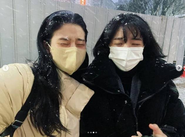 공개된 사진 속 내리는 눈을 맞으며 셀카를 찍고 있는 박주현, 채수빈의 모습이 담겨 있다.