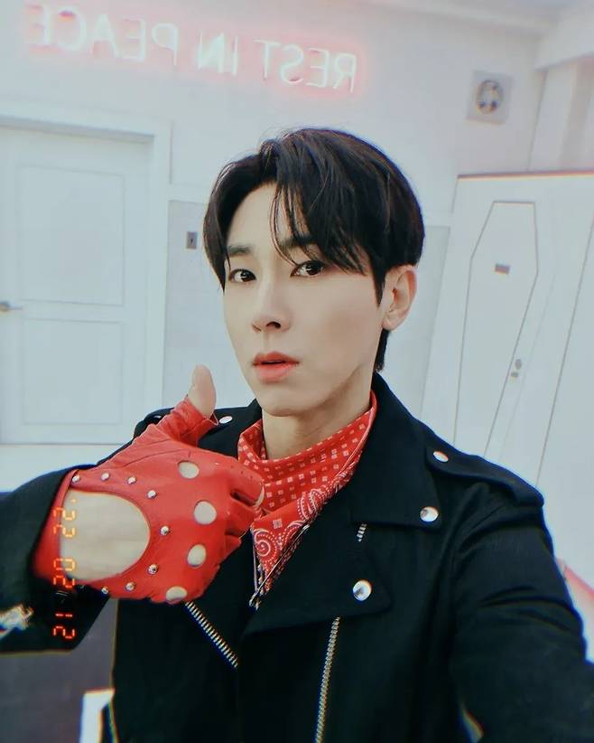 사진 속에는 강렬한 레드 앤 블랙 패션으로 뮤비 세트장에서 셀카를 찍는 유노윤호의 모습이 담겨있다. 유난히 뽀얀 피부를 자랑한 그는 무표정 브이와 엄지척 포즈로 카리스마를 발산했다.