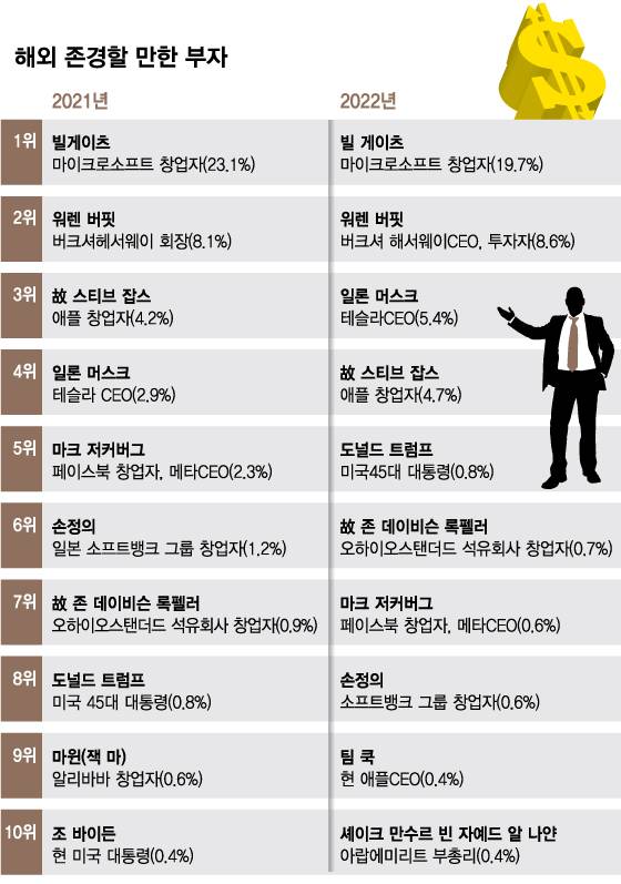 해외 인물들 가운데선 올해도 빌 게이츠 마이크로소프트 창업자가 19.7% 지지를 얻어 1위를 차지했다. 빌 게이츠는 2008년 이후 조사에서 한번도 1위를 놓친 적이 없다. 하지만 2009년 41.7% 지지율은 2018년 26.8%로 떨어졌고, 올해는 10%대로 추락해 위상변화를 보였다. 올해 2위는 조사 개시 이후 변함없이 빌 게이츠와 매년 1, 2위를 동행한 워렌 버핏 버크셔 해서웨이 CEO(8.6%)가 차지했다.
