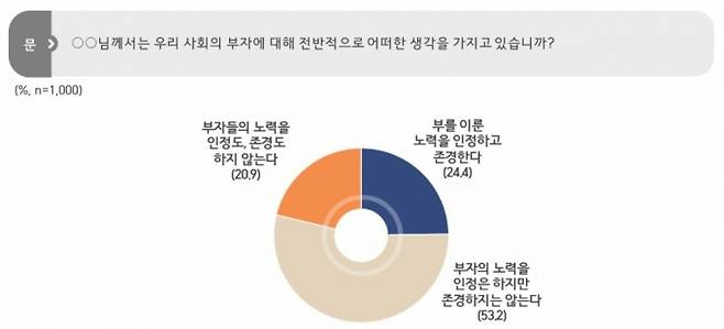 다만 부자에 대한 존경은 호감도와 달랐다. 부자를 존경하지 않는다는 비중이 74.1%를 차지했다. '부자의 노력을 인정은 하지만 존경하지 않는다'라는 답변이 절반(53.2%)을 넘었고, '노력을 인정도, 존경도 않는다'는 답변이 20.9%를 차지했다. 단순히 좋아하는 것과 '부자의 인격이나 행동을 마음 속에서 공경할 수 있느냐'는 다른 문제였다.