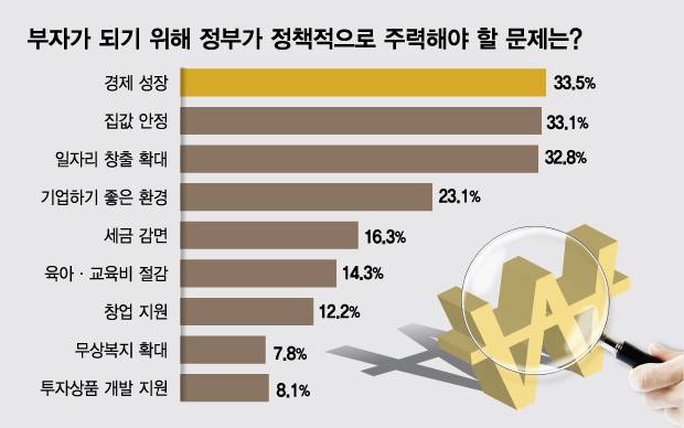 머니투데이가 여론조사업체 케이스탯리서치에 의뢰해 발표한 '당당한 부자' 여론조사 결과에 따르면 '부자가 되기 위해 정부가 정책적으로 주력해야 할 문제는 무엇이냐'는 물음에 응답자들은 경제 성장(33.5%, 이하 중복응답), 집값 안정(33.1%), 일자리 창출 확대(32.8%) 등을 꼽았다.