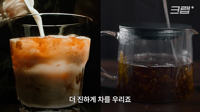 그런데 밀크티는 우유를 섞기 때문에 차가 희석되는 것을 고려해 뜨거운 물에 잎만