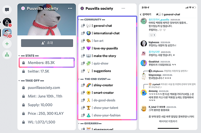 미래 가치를 드러내듯 디스코드 내 푸빌라 커뮤니티에는 8만 5,300명(5월 25일 기준)의 예비 홀더들이 모였다. 국내 최대 NFT운영팀 메타콩즈 커뮤니티 멤버수인 6만 2,900명(5월 25일 기준)을 넘어선 숫자다. 커뮤니티에는 푸빌라 소사이어티의 발전과 흥행을 기대하는 이들이 넘쳐난다. 또 이들은 여러 미션을 수행하며 활동하는데, 이는 푸빌라 NFT 구매 우선권을 받을 수 있는 2차 ‘화이트리스트’에 선정될 수 있기 때문이다.