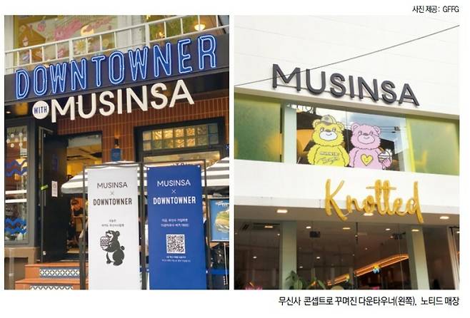 그러던 중 2002년 무신사로부터 솔깃한 제안을 받았다. 다운타우너와 노티드 매장에 무신사 테마를 입혀 일종의 무신사 쇼룸으로 꾸미자는 것이었다. GFFG는 무신사와의 협업을 통해 고객들에게 보다 새로운 공간과 제품을 선보이며 신선한 경험을 선사할 수 있을 것으로 보였다. 또한 무신사가 보유한 광고 채널에 이벤트 소식과 함께 다운타우너, 노티드를 알릴 수 있다면 브랜드 인지도를 높이고 새로운 고객을 유입하는 데도 큰 도움이 될 것이라 판단했다.
