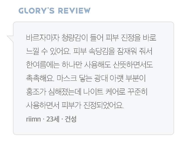 블루 캐모마일 추출물과 히알루론산으로 피부 자극을 해결해주는 마몽드 수분 진정크림을 소개해요! 캐모마일에서 추출한 핵심 효능 성분인 ‘아줄렌’으로 시카보다 강력한 진정을 느낄 수 있는 것도 특징인데요. 이 제품은 특히 마스크 착용으로 인해 예민해진 피부를 자극하는데 효과적이라고 해요. 건조해지고 거칠어지는 피부 트러블과 외부 자극으로 인한 붉은기는 물론 속건조까지 채워주는 코로나 시국 필수 진정크림! 궁금하다면 글로리 리뷰도 확인해보세요.