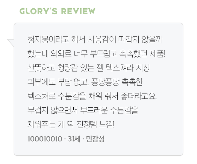 블루 캐모마일 추출물과 히알루론산으로 피부 자극을 해결해주는 마몽드 수분 진정크림을 소개해요! 캐모마일에서 추출한 핵심 효능 성분인 ‘아줄렌’으로 시카보다 강력한 진정을 느낄 수 있는 것도 특징인데요. 이 제품은 특히 마스크 착용으로 인해 예민해진 피부를 자극하는데 효과적이라고 해요. 건조해지고 거칠어지는 피부 트러블과 외부 자극으로 인한 붉은기는 물론 속건조까지 채워주는 코로나 시국 필수 진정크림! 궁금하다면 글로리 리뷰도 확인해보세요.