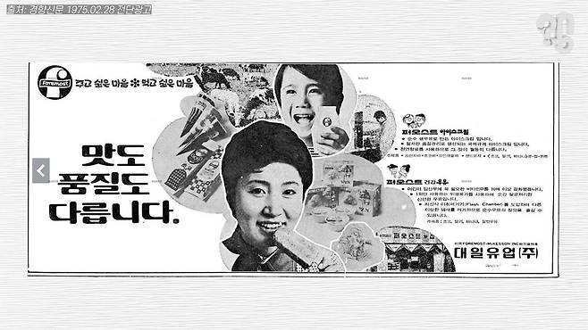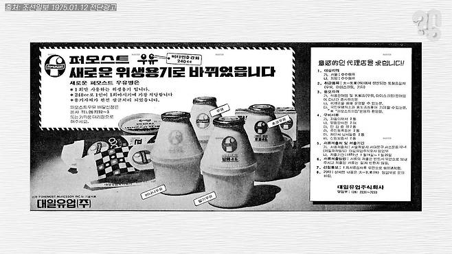 1975년 1월 12일자 신문 1면에 실린 대일유업의 ‘퍼모스트 우유’ 광고에는 바나나맛 단지우유와 함께 딸기우유, 흰 우유, 초코우유가 나란히 놓여있다. 빙그레의 전신인 대일유업은 1972년부터 미국 퍼모스트 맥킨사와 기술제휴를 통해 아이스크림과 우유 생산에 나섰고, 1974년 마침내 우리가 잘아는 바나나맛 우유를 출시한다. 광고 사진을 보면 이 당시에는 ‘퍼모스트 우유’로 소개됐고 상표 로고도 지금과는 다르다.