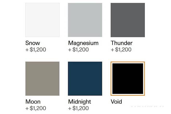 폴스타2의 기본 외관 색상은 Void(검정색)다. 옵션으로 제공되는 외관 색상은 Magnesium, Snow, Thunder, Moon, Midnight인데, 미국 기준 1200달러(약 140만원)를 추가해야 한다. 중국도 외관 색상을 무료로 변경할 수 있지만, 국내와 다르게 일부 옵션을 변경해야만 한다.