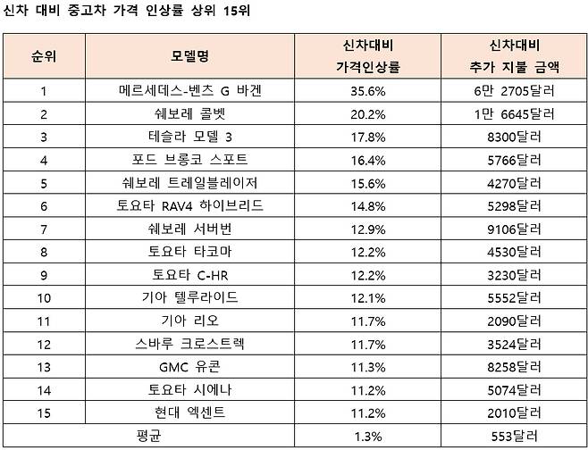기아 텔루라이드와 리오(국내명 프라이드), 현대 엑센트 등 국산차의 중고차 가격도 신차 가격을 넘어선 것으로 나타났다. 특히 텔루라이드는 2019년 출시 이후 큰 사랑을 받아 신차 가격이 인상되기도 했다. 그럼에도 신차를 구하기 힘들어졌고, 눈길을 중고차로 돌린 소비자들이 텔루라이드 중고차 가격을 크게 상승시켰다.
