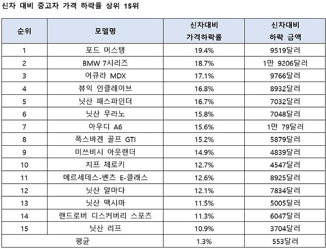 포드 머스탱은 신차 구입 후 1년이 지나지 않았지만 20% 가까운 손해를 보는 것으로 나타났다. BMW 7시리즈, 아우디 A6, 벤츠 E-클래스와 같은 프리미엄 모델도 중고차로 구입할 경우 1천만 원 이상 저렴하게 내 것으로 만들 수 있다. 최근 세단 모델의 인기가 감소한 것이 중고차 가격 방어를 어렵게 만들었다는 해석이다.