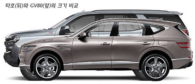 타호와 비교하면 GV80은 크기가 작기도 하지만, 사실 크기보다도 GV80의 지붕 선이 뒤로 갈수록 주저앉는 디자인이라는 게 눈에 띈다. 무릇 국산 플래그십 SUV 라면 차체 자세가 당당해야 하는데, 필자는 GV80이 처음 나왔을 때부터 저렇게 뒤로 갈수록 주저앉는 지붕 실루엣을 선택한 이유가 궁금했다. 게다가 GV80의 A-필러의 이미지는 SUV로서는 어딘지 모르게 존재감을 어필하지 못하는 듯 하다. 하지만 이미 그렇게 나온 차를 어찌 하겠는가….