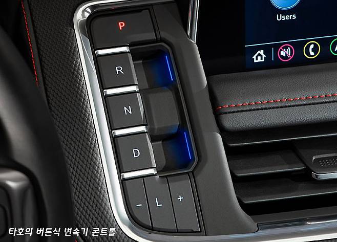 타호의 인스트루먼트 패널은 수평적으로 흐르는 밝은색 슬림 몰드를 기준으로 상부 패널을 분리해서 공간감을 강조한 모습이다. 물론 기본적으로 차체의 폭이 넓기 때문에 더욱 더 그런 인상이 드는데, 특히 앞 좌석 중앙의 암 레스트와 콘솔 박스의 폭을 보면 정말로 실내 폭이 넓음을 알 수 있다.