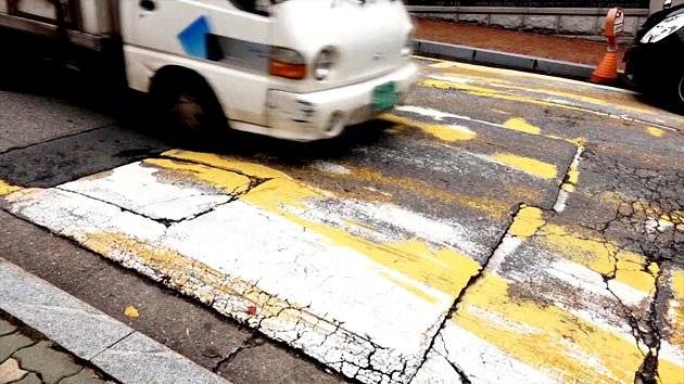 3. 가상형이 있습니다. 이것은 노란색, 흰색 줄무늬를 그대로 표시하지만 실제 턱은 없습니다. 원리는 운전자가 과속방지턱인 것으로 착각함으로써 스스로 속도를 줄이도록 하는 것이죠.