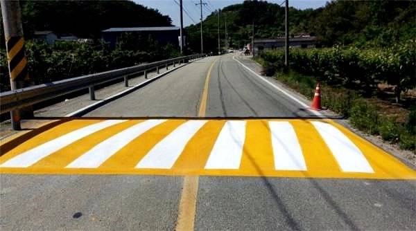 3. 가상형이 있습니다. 이것은 노란색, 흰색 줄무늬를 그대로 표시하지만 실제 턱은 없습니다. 원리는 운전자가 과속방지턱인 것으로 착각함으로써 스스로 속도를 줄이도록 하는 것이죠.