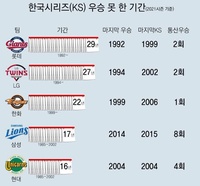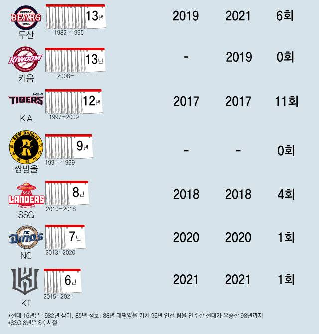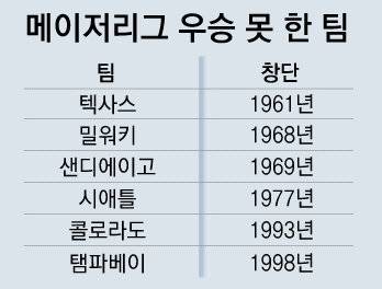 메이저리그 30개 구단 중 20%인 6개 구단은 창단 후 여태 우승을 못했다. 텍사스는 1961년부터 51년간, 밀워키는 1968년부터 44년간, 샌디에이고는 1969년부터 43년간 무관이다. 최근에 휴스턴(1962년 창단)이 55년만인 2017년, 워싱턴(1969년 창단)이 50년만인 2019년 첫 우승반지를 꼈다. 국내에선 키움이 2008년 창단 후 13년간 우승 못한 게 최장 기록이다. 쌍방울(1991~99년)은 9년간 무관이었지만 대를 잇는 기업 없이 역사 속으로 사라졌다.
