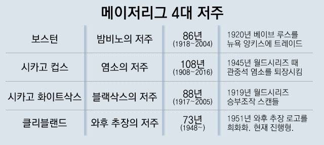 우리나라보다 100년 이상 역사가 오랜 만큼 저주의 기간도 비교 불가다. 보스턴은 원조 이도류(二刀流·양 손에 칼 또는 검을 든 검법)인 투타의 신 베이브 루스를 1920년 뉴욕 양키스에 트레이드 하면서 1918년 이후 2004년까지 86년간 우승을 못하는 밤비노(루스의 애칭)의 저주에 시달렸다. 뉴욕, 로스앤젤레스에 이어 미국 3대 도시인 시카고의 컵스는 염소의 저주(108년), 화이트삭스는 블랙삭스의 저주(88년)를 푸는데 1세기가 걸렸다. 73년 된 클리블랜드 와후 추장의 저주는 현재 진행형이다.