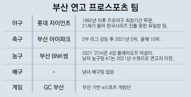 문제는 역시 롯데다. 롯데 탓인지 부산의 다른 프로 스포츠도 암흑기를 맞고 있다. 프로축구단 부산 아이파크는 2020년 시즌 후 1부 리그에서 2부 리그로 강등됐다. 지난해 여기에서도 5위에 머물더니 올해는 꼴찌 바로 위인 10위(3승 5무 11패)다. 부산 축구는 대우 로얄즈 시절인 1984년, 87년, 91년, 97년 4회나 정규리그에서 우승했지만 이후 무관이다.