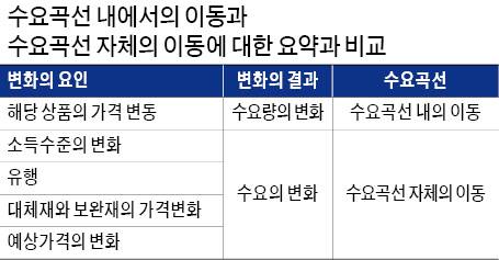지난주부터 계속 설명한 내용이지만, 수요곡선 자체의 이동과 구분해 알아둬야 할 것은 가격 변동으로 수요량이 달라지는 것은 수요곡선의 이동이 아니라 수요곡선 그 자체로 설명된다는 것이다. 정리해 보면 해당 상품의 가격 변화는 수요곡선 위의 이동으로 표현되고 가격을 제외한 나머지 요인들의 변화는 수요곡선 자체의 이동으로 표현된다.