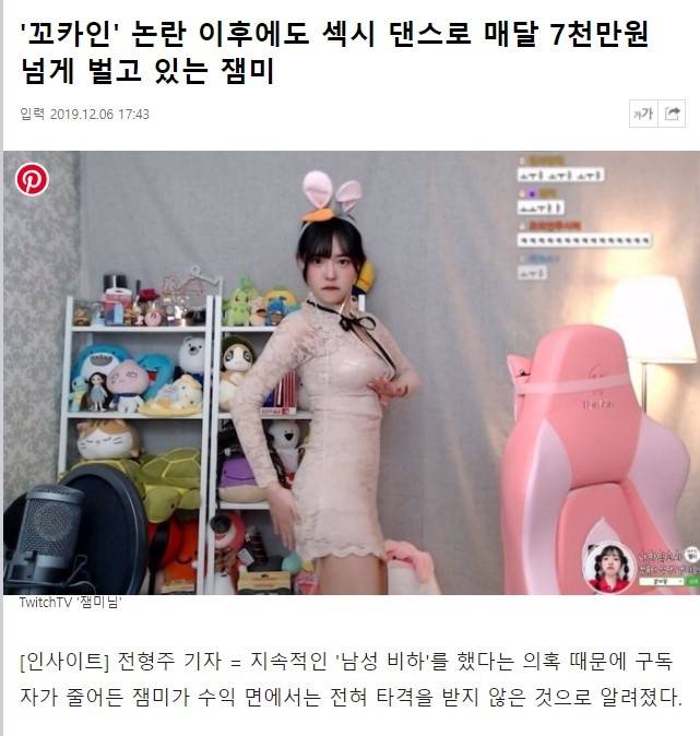 | ▲ 인사이트의 기사 <‘꼬카인’ 논란 이후에도 섹시 댄스로 매달 7천만원 넘게 벌고 있는 잼미>(2019.12.6) |