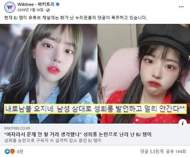 | ▲ 위키트리 기사 < BJ 잼미, 남성 비하 논란에 중단했던 ‘이것’ 결국 다시 했다 > (2019.12.8) |