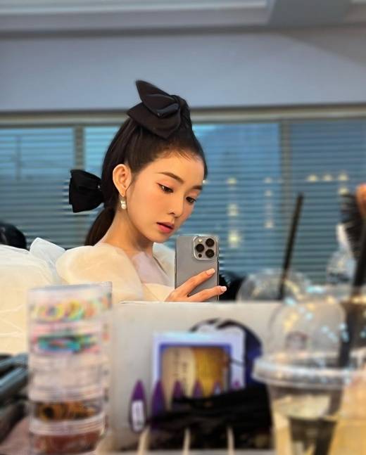 아이린은 거울에 비친 모습을 휴대전화 카메라로 촬영했다. 머리카락에 커다란 리본 두 개를 단 모습인데, 화려한 헤어스타일이 아이린의 작은 얼굴을 더 돋보이게 한다.
