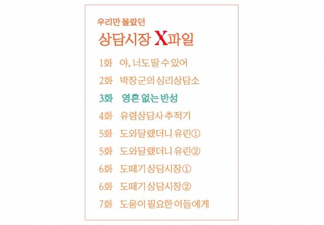 ※‘우리만 몰랐던 상담시장 X파일’ 시리즈는 국민일보 홈페이지 이슈&탐사 코너(www.kmib.co.kr/issue)에서 모두 보실 수 있습니다.