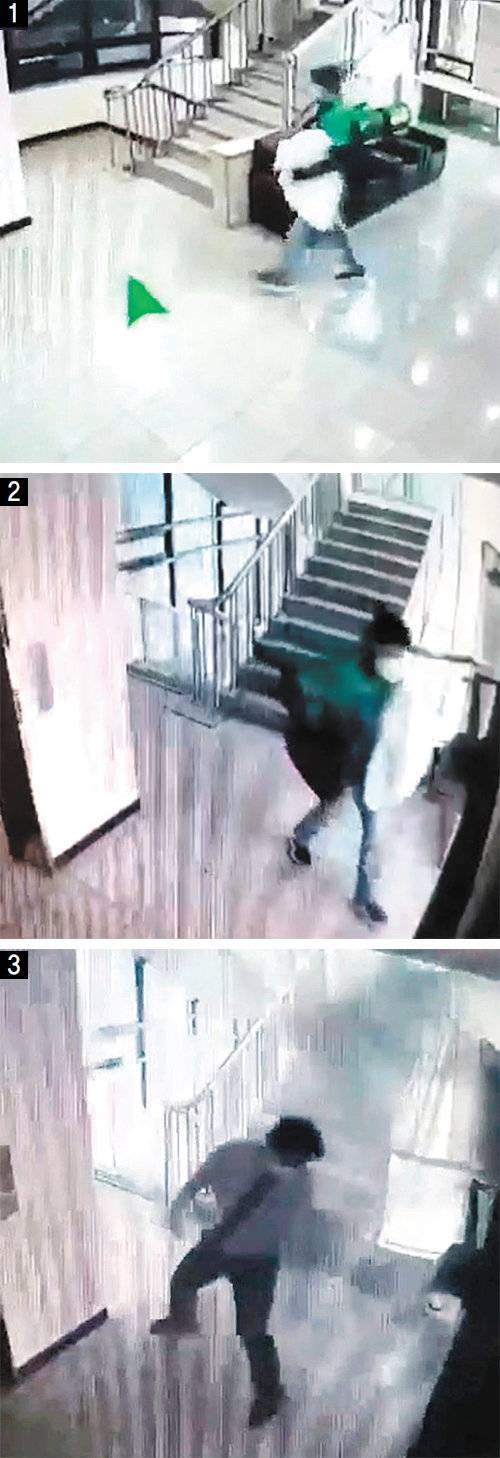 흰 천으로 감싼 인화물질 들고 변호사 사무실로 9일 건물 폐쇄회로(CC)TV에 담긴 대구 수성구 범어동 변호사 사무실 화재 당시 모습. ①용의자 천모 씨로 추정되는 남성이 오전 10시 52분경 흰 천으로 싼 물체를 든 채 건물 1층에 들어서고 있다. ②계단을 통해 2층에 올라온 이 남성이 203호로 향하고 있다. ③남성이 사무실에 들어서고 약 25초가 지난 뒤 사람들이 뛰쳐나왔고, 새어나온 짙은 연기가 복도를 뒤덮었다. CCTV 화면 캡처