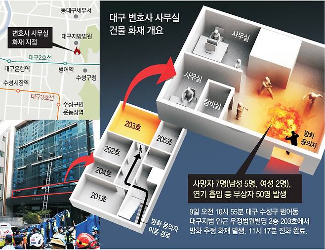 9일 대구소방안전본부와 대구경찰청에 따르면 이날 오전 10시 55분경 수성구 범어동 우정법원빌딩 2층 사무실(203호)에서 화재가 발생했다는 신고가 119에 접수됐다. 곧바로 출동한 소방대가 22분 만에 진화했지만 김모 변호사(57) 등 이 사무실에서 일하던 6명과 방화 용의자 천모 씨(53)가 현장에서 숨졌다. 부상자 50명은 모두 경상으로 그중 31명이 병원으로 옮겨져 치료를 받았다.