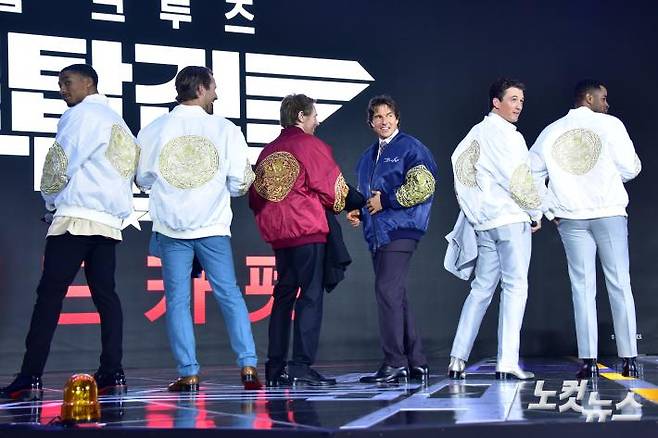 헐리우드 배우 톰크루즈, 마일즈텔러, 글렌포웰, 그렉타잔데이비스, 제이엘리스, 제작자 제리브룩하이머가 19일 오후 서울 잠실 롯데월드타워에서 열린 영화 '탑건 : 매버릭' 내한 레드카펫 행사에서 곤룡포의 문양을 딴 항공점퍼를 선물 받고 포즈를 취하고 있다.