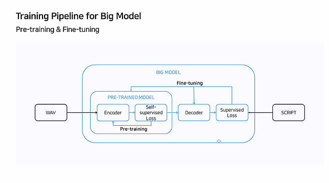 클로바노트에 적용한 빅모델은 모델 자체도 훨씬 더 커졌고, 모델을 학습할 때 텍스트없이 음성 파일만 가지고 있어도 된다. ‘프리 트레인드 모델(PRE-TRAINED MODEL)’이라는 것을 만들 수 있어서다. 빅모델은 내부에 작은 두 개의 모델이 존재한다. 하나가 프리 트레인드 모델, 하나가 ‘파인튜닝(Fine-tuning)’. 파인튜닝은 전사한 스크립트가 더해져 좀 더 잘 튜닝되는 단계다.