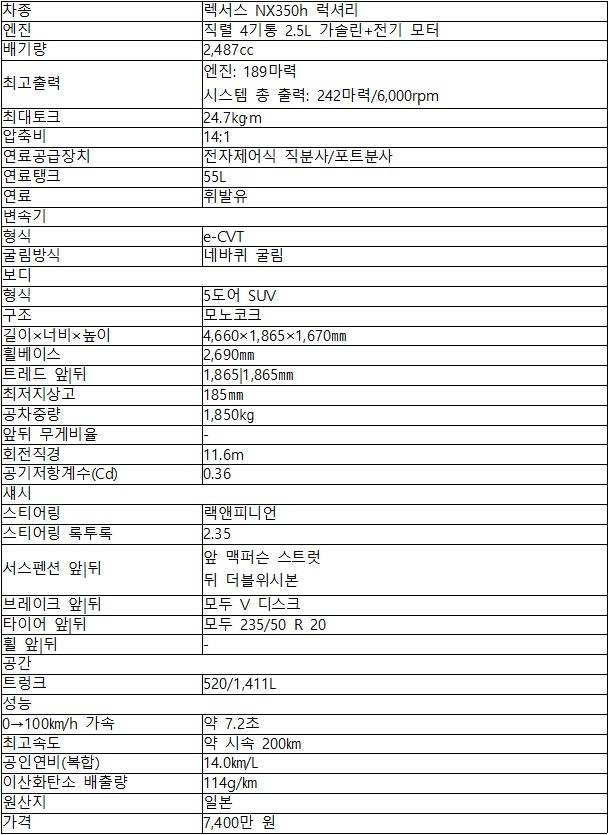 추첨을 통해 배정받은 트림은 NX350h. 직렬 4기통 2.5L 가솔린 엔진과 전기 모터 3개를 맞물렸다. 엔진 출력만 189마력이며, 시스템 최고출력은 242마력을 뿜는다. 이전 세대보다 43마력 올랐다. 타케아키 카토에 따르면, 2세대는 효율보다 주행 성능에 중점을 두고 개발했다. 모터 사이즈를 키워 토크를 보강했다. 그러나 연비도 16.7% 올라 14.0㎞/L(복합)를 달성했다. 플랫폼은 ES와 공유하는 ‘GA-K’.