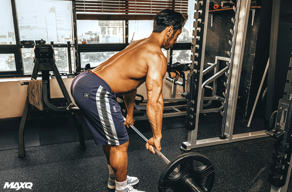 <동작> 무게중심이 무너지지 않도록 신경 쓰며 호흡을 멈추고 복부에 힘을 준 상태로 바벨을 복부 쪽으로 당긴다. 어깨는 고정하고 팔과 팔꿈치를 뒤로 당겨 준다는 느낌으로 당겼다가 준비자세로 돌아온다.