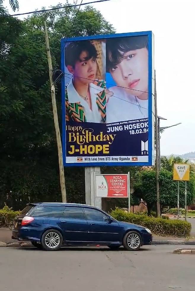 캄팔라 도로변에 우뚝 서 있는 대형 광고판에는 제이홉의 얼굴 사진과 함께 ‘메인댄서, 래퍼, 프로듀서, 보컬리스트 정호석(본명)’이라는 소개 문구와 생일 축하 멘트가 쓰여있다.