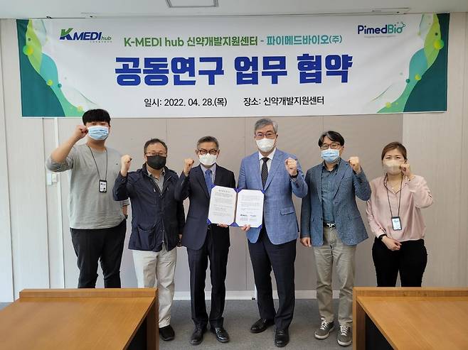 케이메디허브는 지난 2018년 ㈜파이메드바이오의 1호 개발후보인 암줄기성 억제 항암제에 대한 기초연구 결과를 기술이전했고, 공동으로 후보발굴연구를 수행해 개발후보를 도출했으며 지난해에는 비임상시험용 원료의약품 생산도 지원한 바 있다.