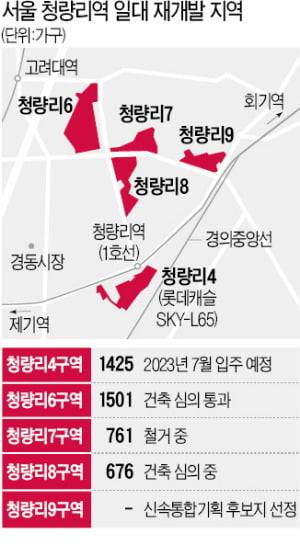 2020년 4월 관리처분 인가를 받은 청량리7구역(재개발 후 761가구)은 현재 70%가량 철거가 진행됐다. 2025년 준공 예정이다. 시공은 롯데건설이 맡았다. 7구역 맞은편 청량리8구역(676가구)은 작년 11월 건축 심의를 신청했다. 이 구역은 시공사와의 공동 시행을 추진해 조합이 단독 시행할 때와 비교해 사업 기간을 1년가량 단축한다는 계획이다. ‘청량리9구역’은 작년 말 서울시가 민간 재개발 속도를 높이기 위해 마련한 ‘신속통합기획’ 대상지로 선정됐다.