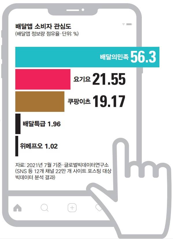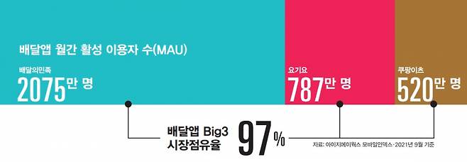 코로나19를 거치는 비대면의 시대에 배달 서비스는 뜨거운 격동기를 마주했다. 2020년 온라인 음식 서비스 거래액은 17조4000억원. 전년보다 78.6% 증가한 수치였다. 2021년에는 10월을 기준으로 이미 20조원을 넘어섰다. 본격적으로 온라인 음식 서비스 거래액을 견인한 것이 배달앱이다. 얼마나 많은 사람이 배달앱을 쓰고 있을까. 국민의 60% 이상이다. 아이지에이웍스 모바일인덱스 집계를 기준으로, 배달앱 3사(배민, 요기요, 쿠팡이츠)의 월간 이용자 수(MAU)는 3300만 명이 넘는다. 이 3사가 배달앱 시장의 90%를 점유한다. '배달'이 정체성이기에 지금까지는 유사한 전략을 펼쳐 왔지만, 최근에는 차별성을 강조하기 위한 각기 다른 계획을 내놓고 있다.