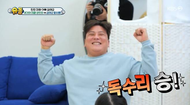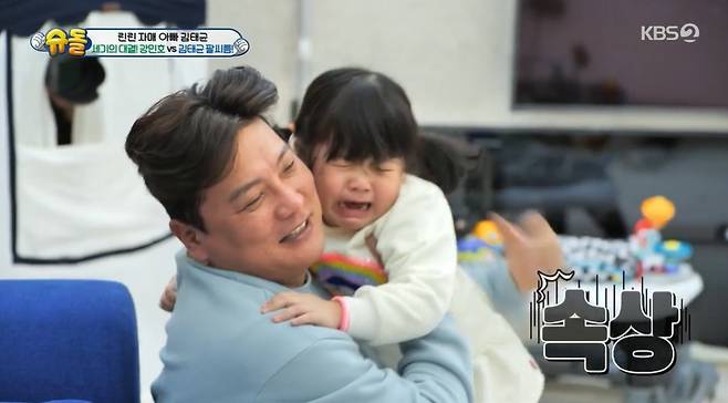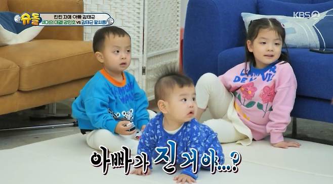 [TV리포트=이혜미 기자] 야구선수 강민호와 그를 똑 닮은 삼남매가 ‘슈돌’에 떴다. 이날 강민호가 김태균과의 팔씨름 대결에서 패한 가운데 아이들은 울음을 터뜨렸다.