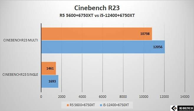 Cinebench의 경우에는 주로 CPU 성능을 체크하는 부분이긴 하지만, 렌더링 기반인만큼 GPU의 성능도 어느정도 가미되는 만큼 포함시켜 보았다. Cinebench의 경우에는 i5-12400이 조금 앞서는 모습을 보여준다.